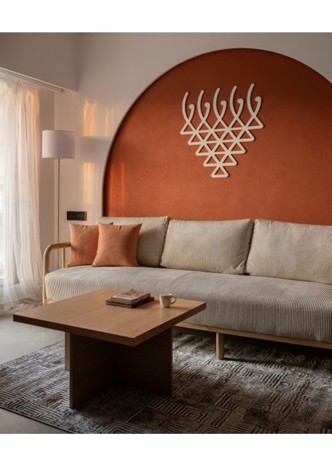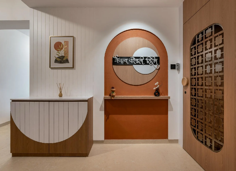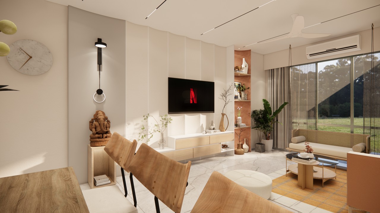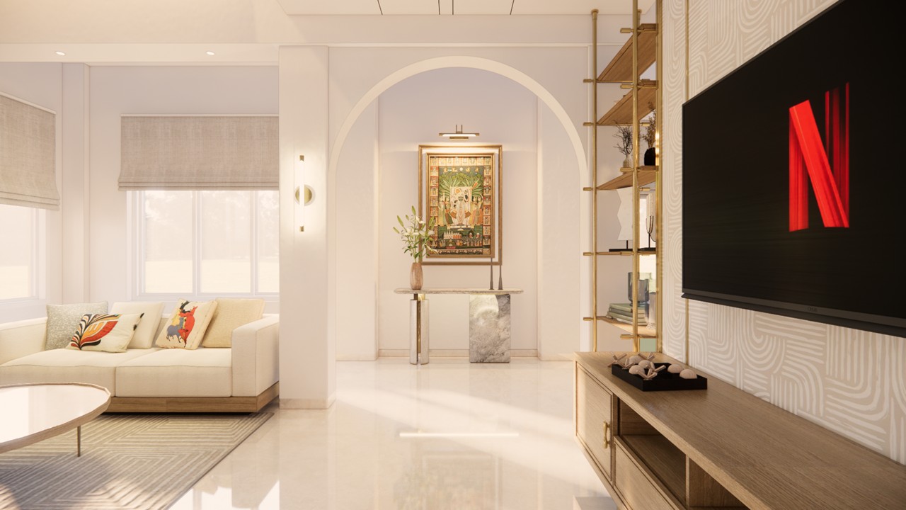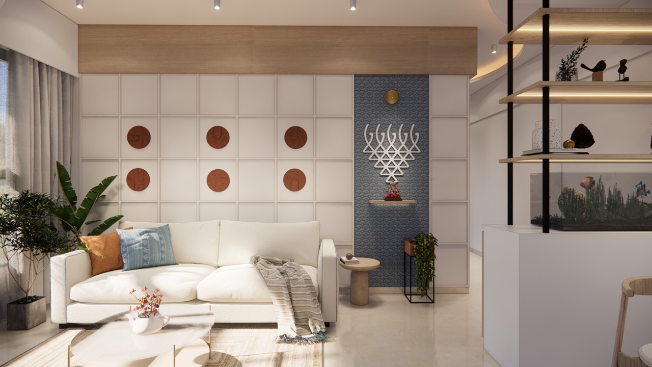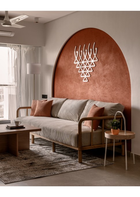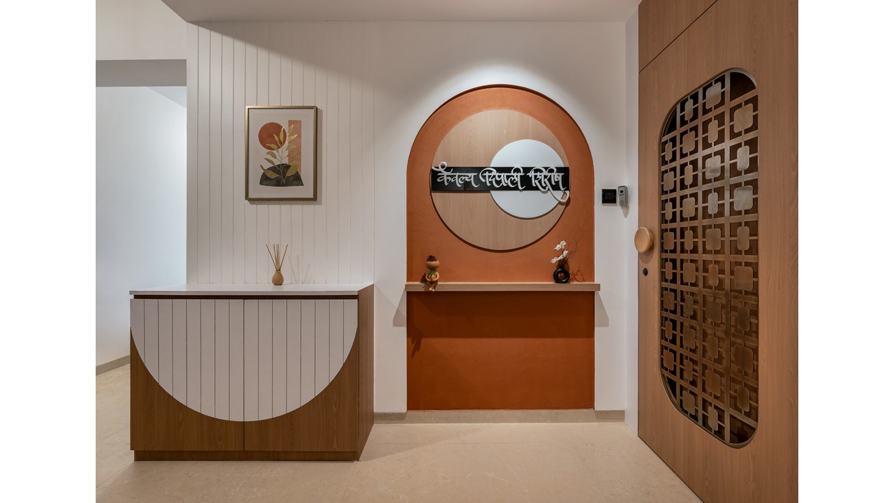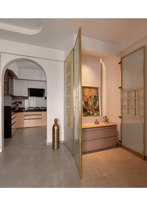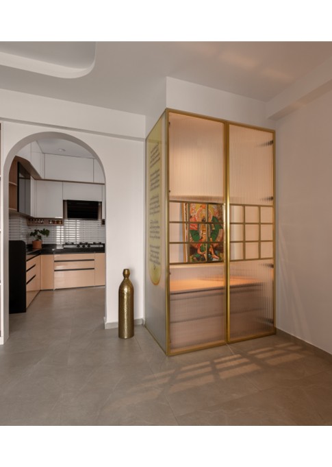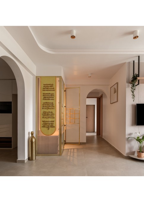 This thoughtfully curated 2BHK residence is a subtle celebration of the occupant’s identity—a renowned writer—through a poetic blend of spatial restraint and symbolic materiality. Designed with a minimalist aesthetic, the interiors embrace a sober color palette, with white lime plaster walls providing a serene canvas, while terracotta accents introduce warmth, grounding the space in earthy authenticity.Drawing inspiration from the writer’s rooted and humble persona, the design steers away from excess, instead employing contextual motifs and personalized elements that narrate his journey. A prominent feature is the custom TV unit, meticulously crafted to accommodate and showcase a collection of literary trophies—an ode to the occupant’s prolific contributions and accolades.The mandir unit is a strikingly bespoke intervention, housing the sacred Tarak Mantra in a layered glass composition, rendered by a calligraphy artist. This detail stands as a spiritual and artistic focal point, merging faith with form.Throughout the home, the material palette is restrained, emphasizing natural finishes, airiness, and simplicity. The juxtaposition of white and terracotta—symbolizing purity and earthiness—establishes a gentle equilibrium, echoing the duality of a literary life: introspective yet impactful.