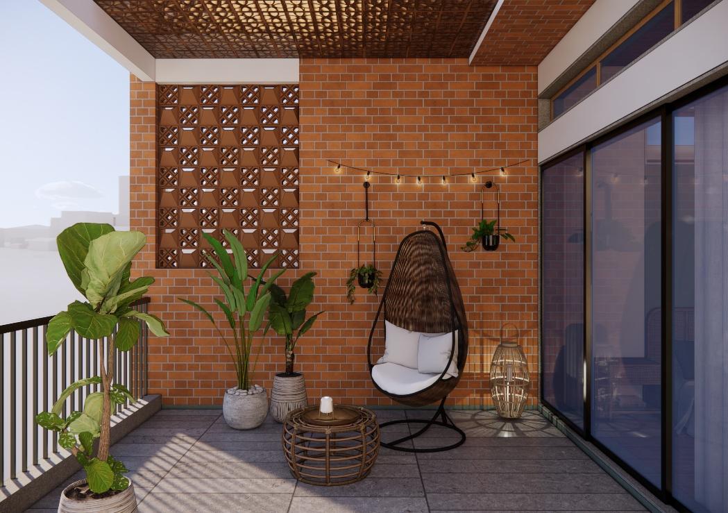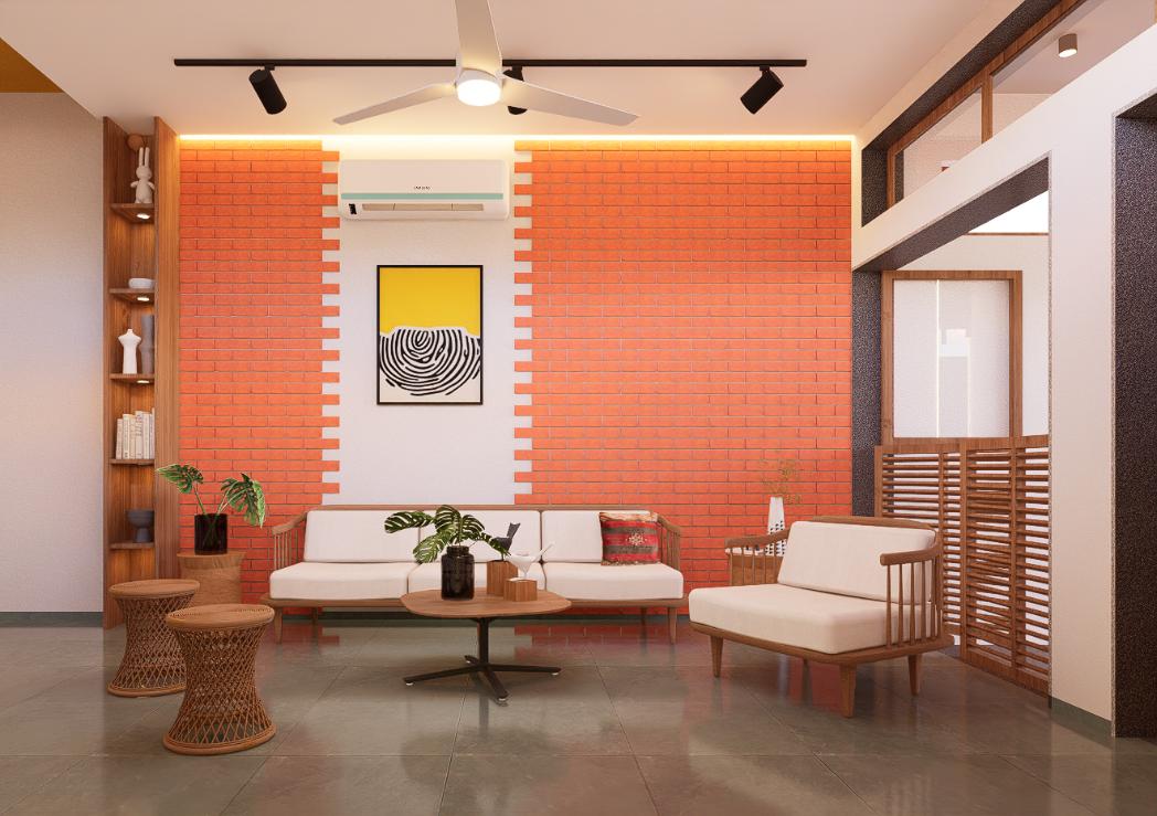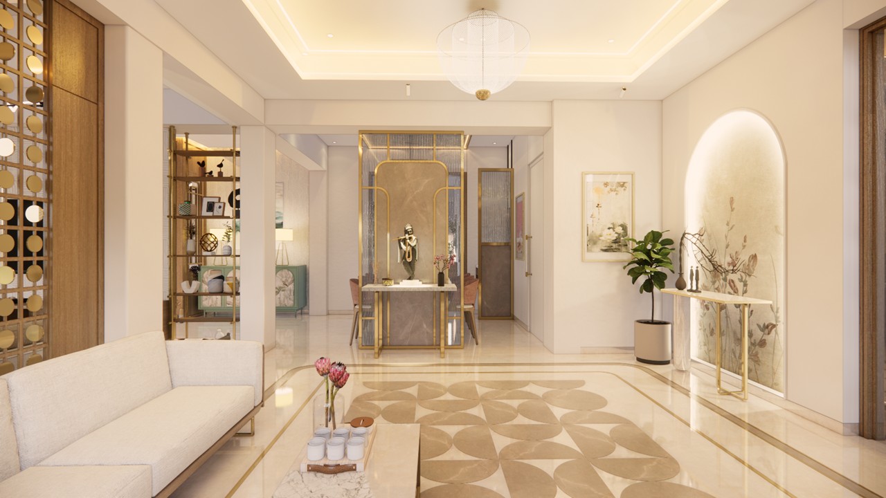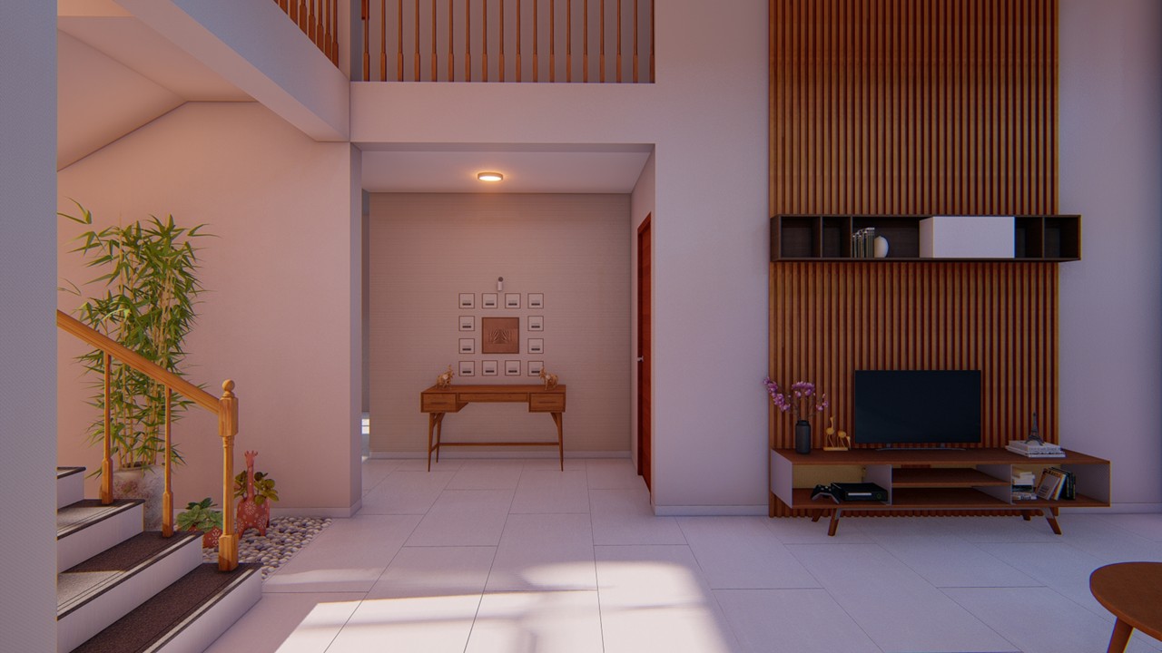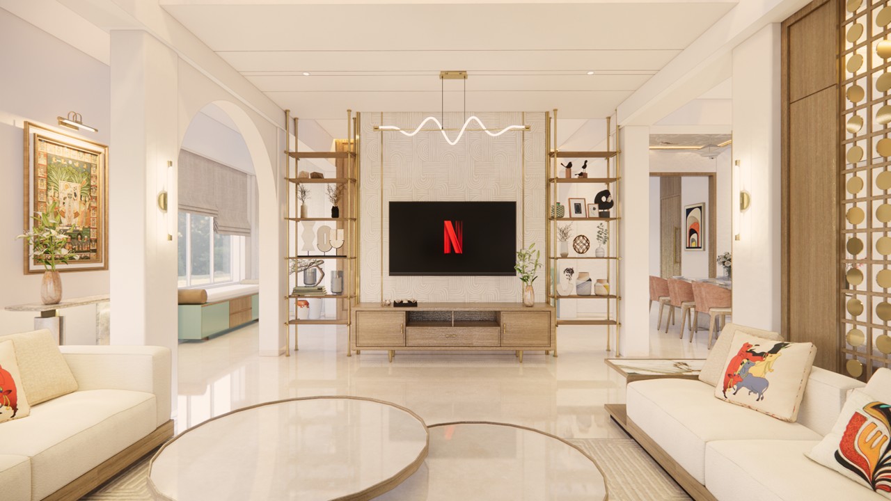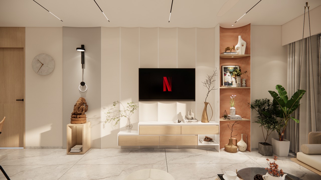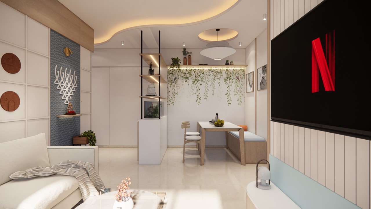 This thoughtfully curated 2BHK residence is a subtle celebration of the occupant’s identity—a renowned writer—through a poetic blend of spatial restraint and symbolic materiality. Designed with a minimalist aesthetic, the interiors embrace a sober color palette, with white lime plaster walls providing a serene canvas, while terracotta accents introduce warmth, grounding the space in earthy authenticity.Drawing inspiration from the writer’s rooted and humble persona, the design steers away from excess, instead employing contextual motifs and personalized elements that narrate his journey. A prominent feature is the custom TV unit, meticulously crafted to accommodate and showcase a collection of literary trophies—an ode to the occupant’s prolific contributions and accolades.The mandir unit is a strikingly bespoke intervention, housing the sacred Tarak Mantra in a layered glass composition, rendered by a calligraphy artist. This detail stands as a spiritual and artistic focal point, merging faith with form.Throughout the home, the material palette is restrained, emphasizing natural finishes, airiness, and simplicity. The juxtaposition of white and terracotta—symbolizing purity and earthiness—establishes a gentle equilibrium, echoing the duality of a literary life: introspective yet impactful.