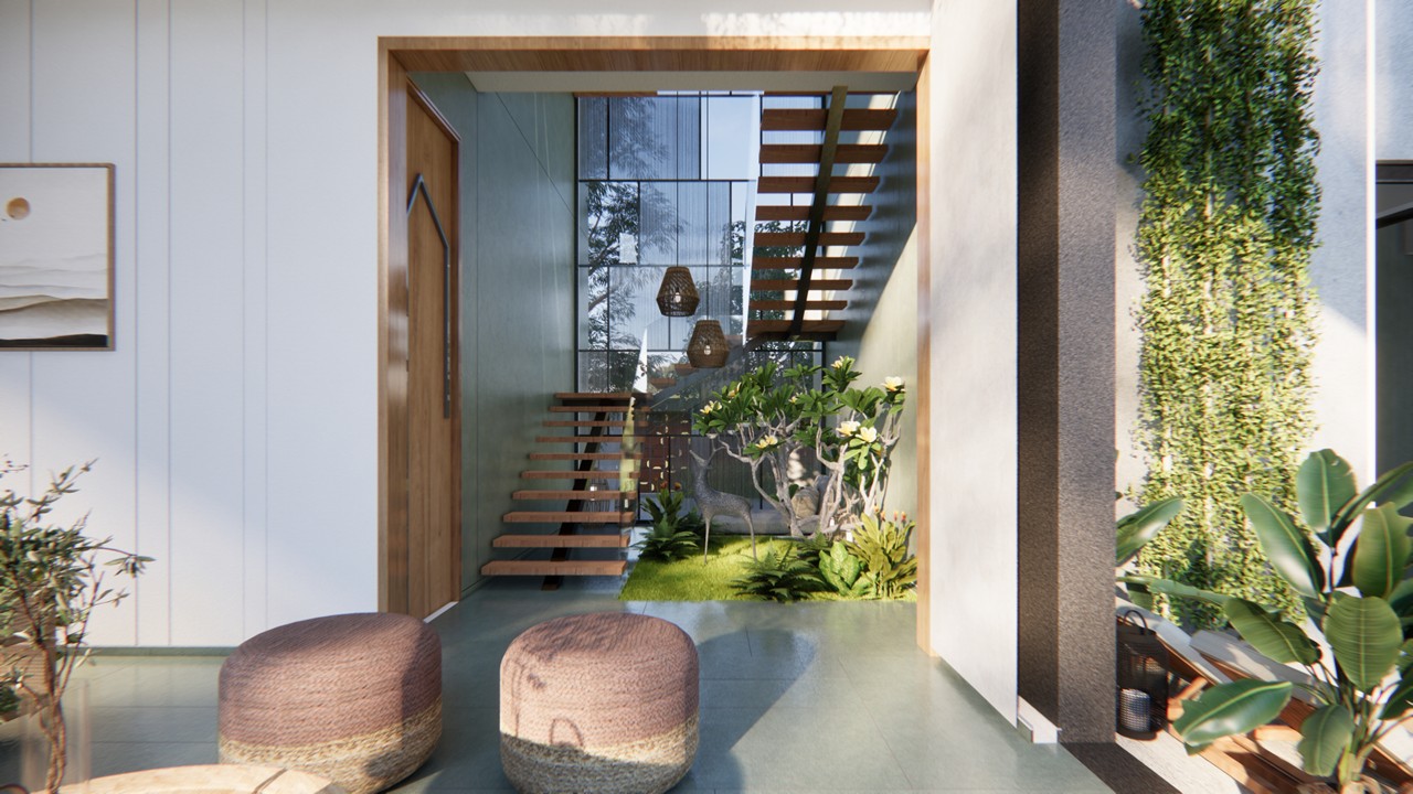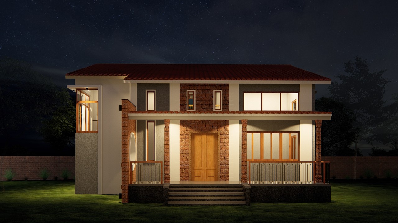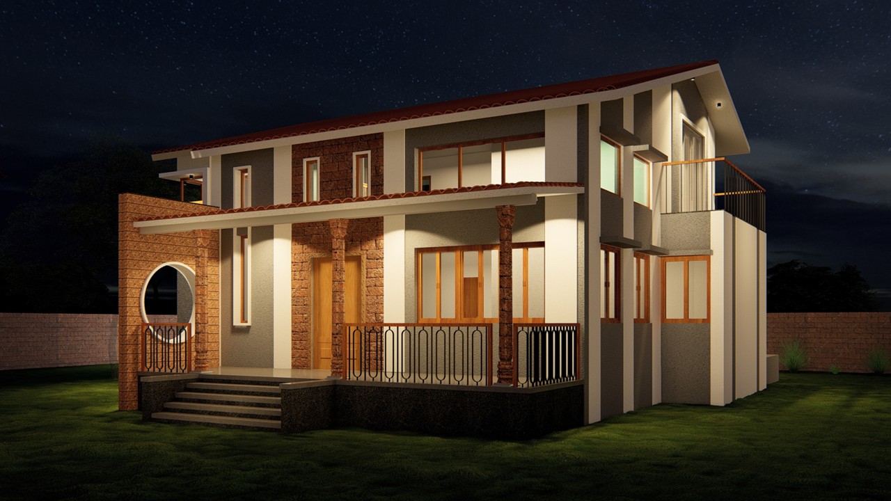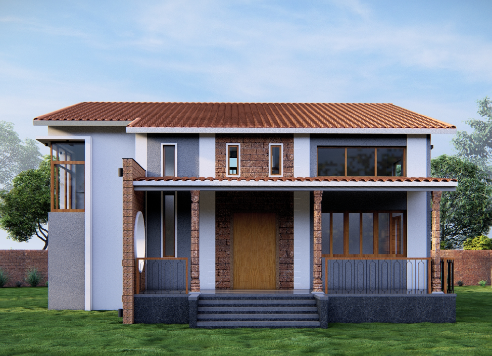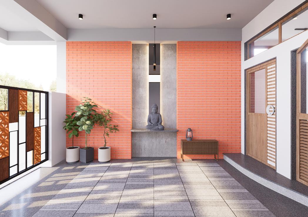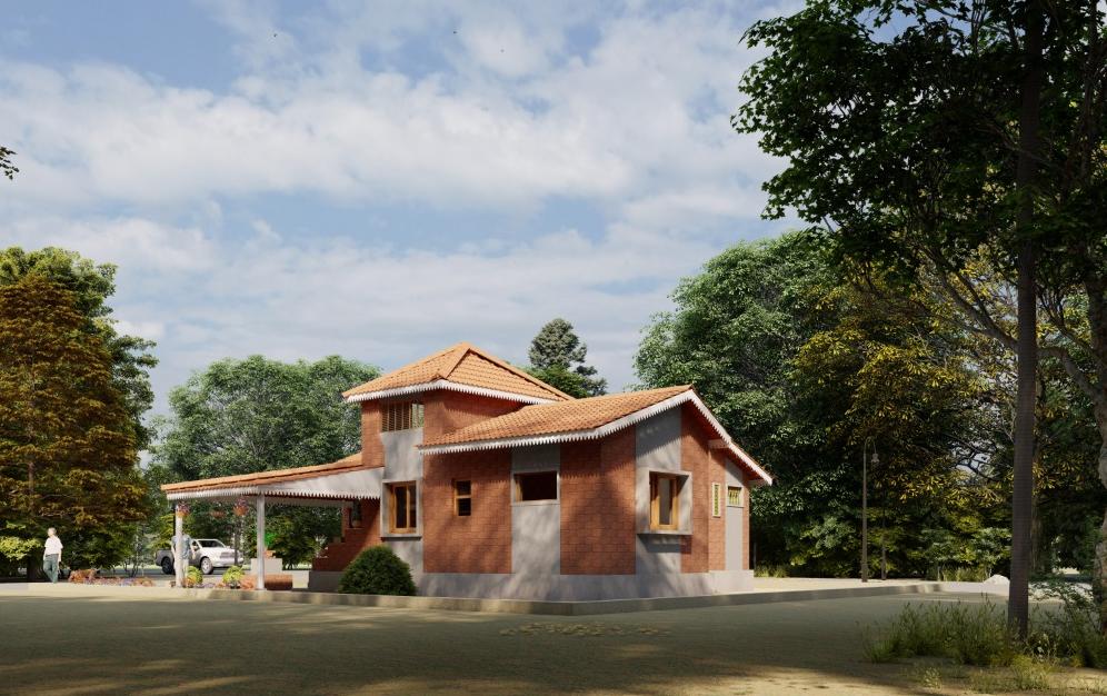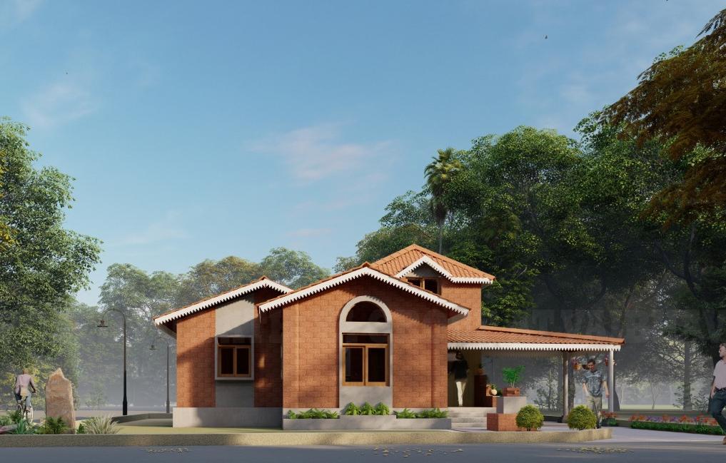 This bungalow is thoughtfully designed to reflect the essence of its local context, incorporating indigenous materials and traditional construction techniques. The architectural form draws inspiration from the surrounding vernacular homes, reinterpreted with a contemporary touch through a modern façade. The planning of the residence adheres to Vastu Shastra principles, ensuring spatial harmony and a balanced flow of energy throughout the home. By blending local character with modern sensibilities, the design achieves a timeless expression that resonates with its environment while standing out through its refined architectural language.