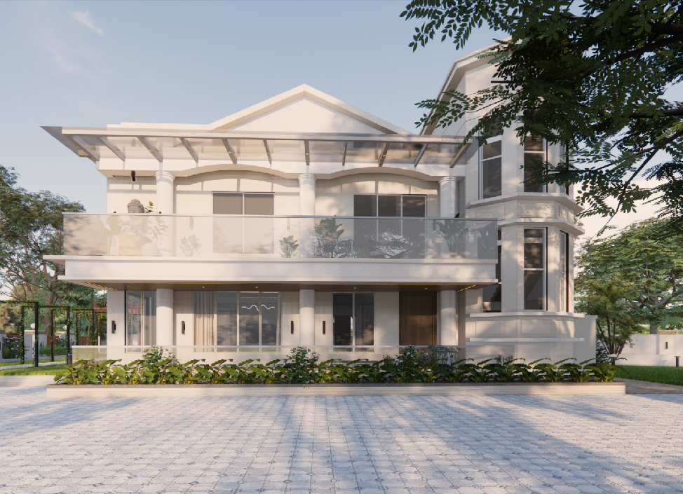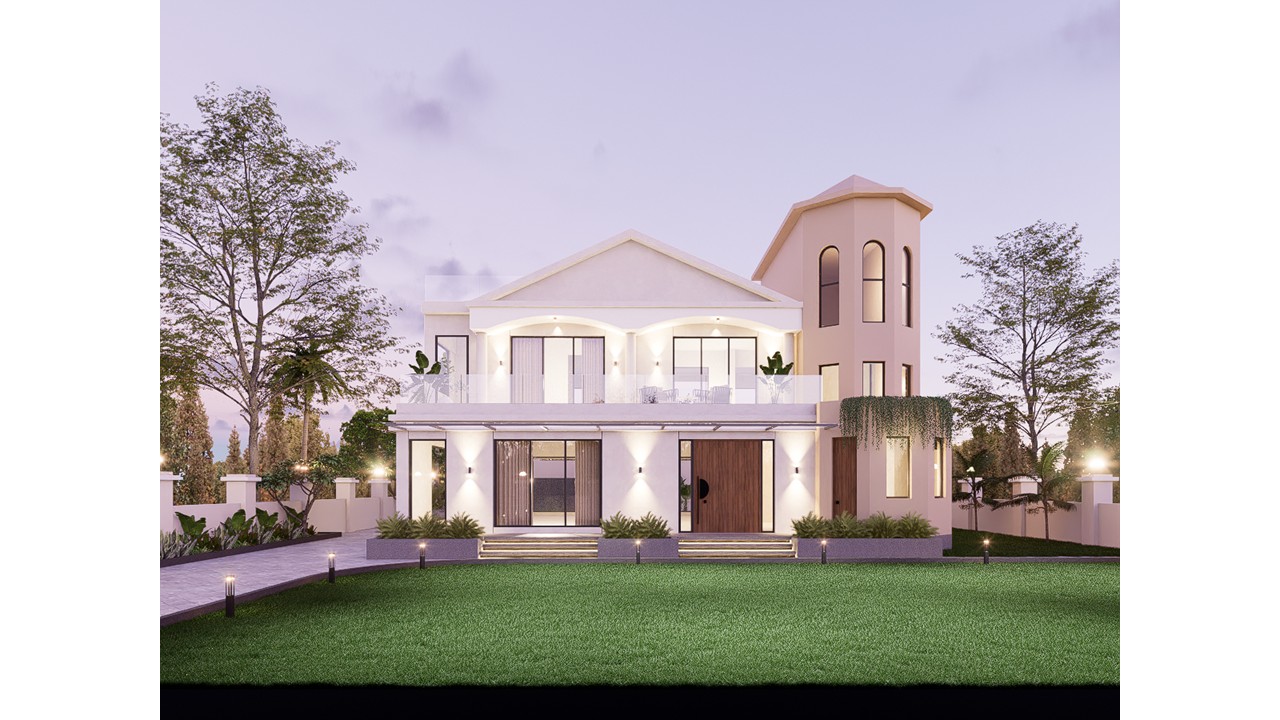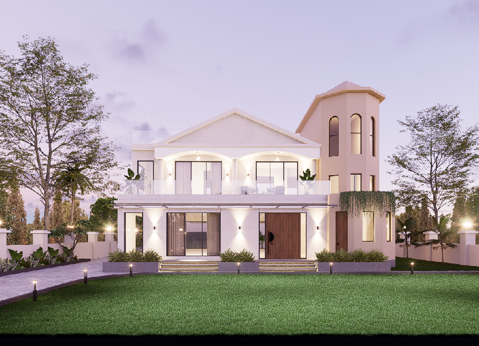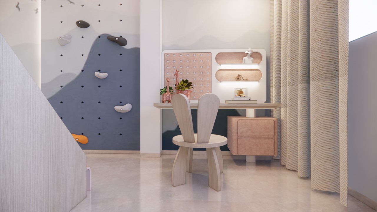 The interiors of this bungalow are crafted to evoke a sense of calm and sophistication, guided by a sober and soothing aesthetic.The material palette is thoughtfully curated—featuring tones of white, warm wood, soft beige, and elegant gold accents—to establish a serene and timeless atmosphere. The design emphasizes natural light, clean lines, and open spaces, creating a canvas of tranquility.This personalized design approach ensures that every space not only serves its purpose but also reflects the personality of its occupant. A notable example is the kid’s bedroom, which beautifully embodies a balance of playfulness and practicality.This tailored methodology enhances each room truly unique and meaningful. The exterior façade embraces a contemporary beige color palette, evoking a sense of timeless sophistication and warmth.This muted tone speaks a modern design language while harmonizing effortlessly with the surrounding environment. Strategically placed landscape elements serve as thoughtful pause points, encouraging interaction with the outdoors and enhancing the experiential quality of the space.These pockets of greenery soften the built form and add depth to the overall composition.
