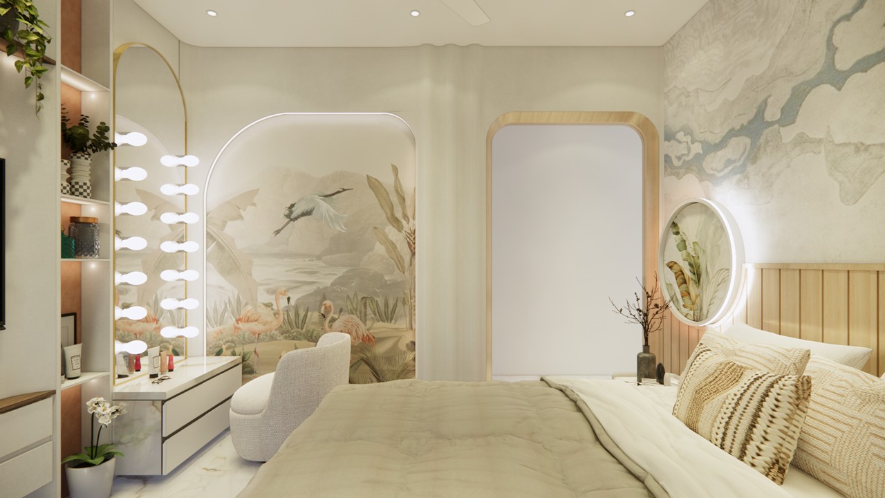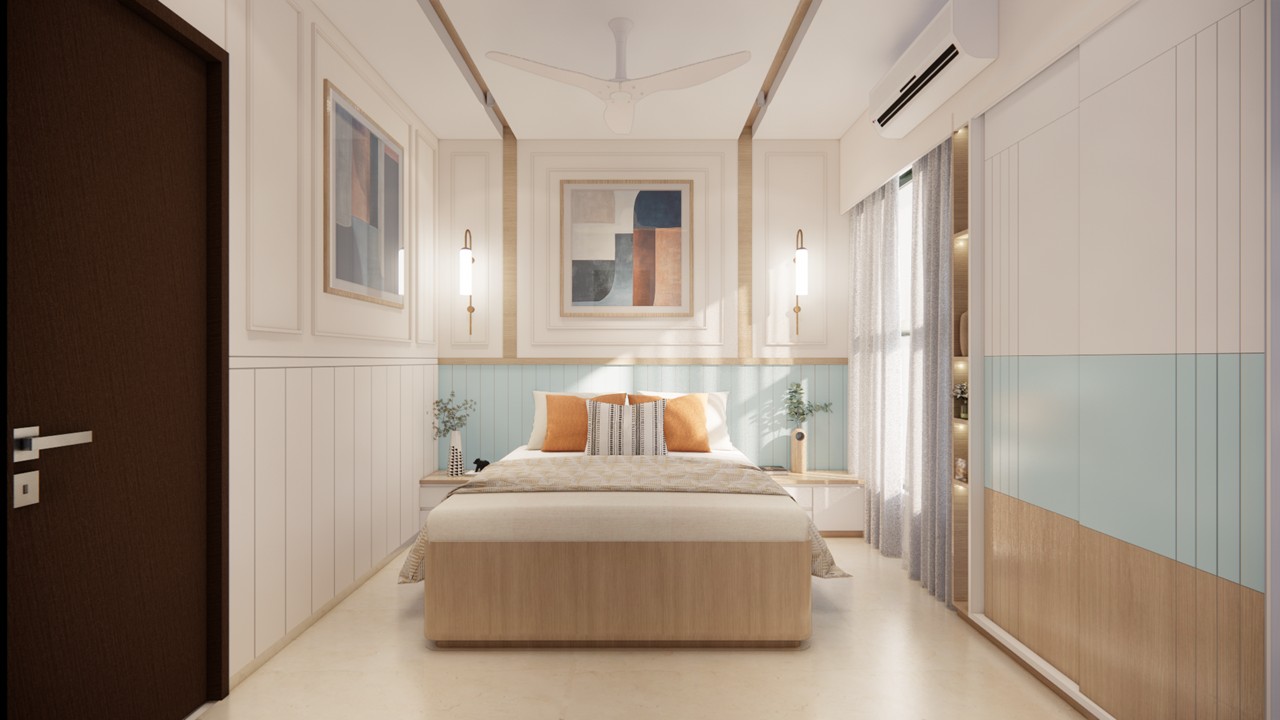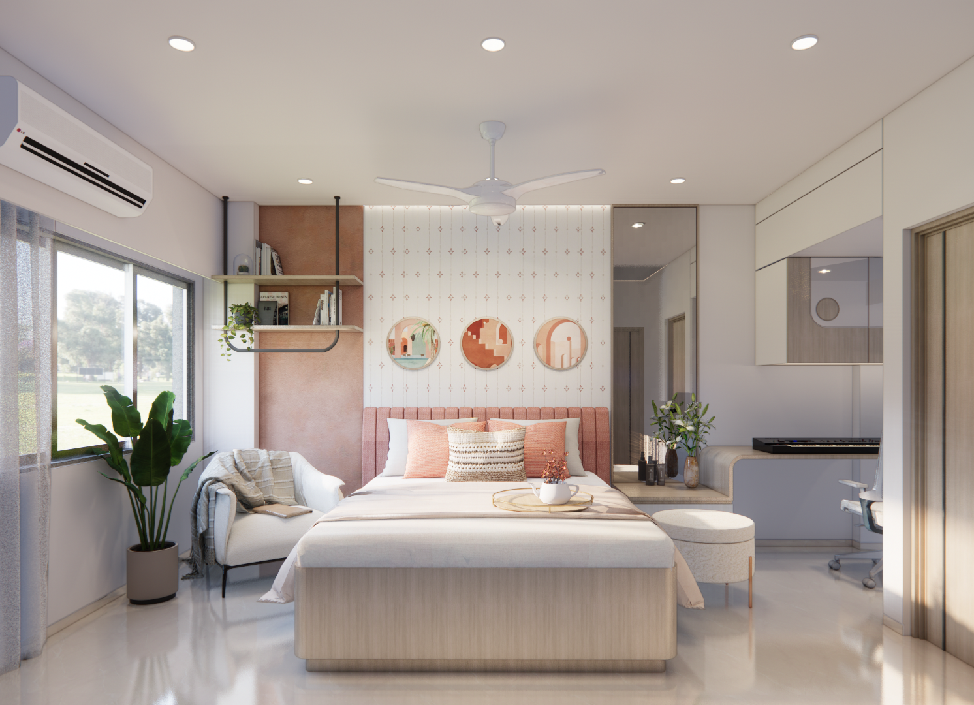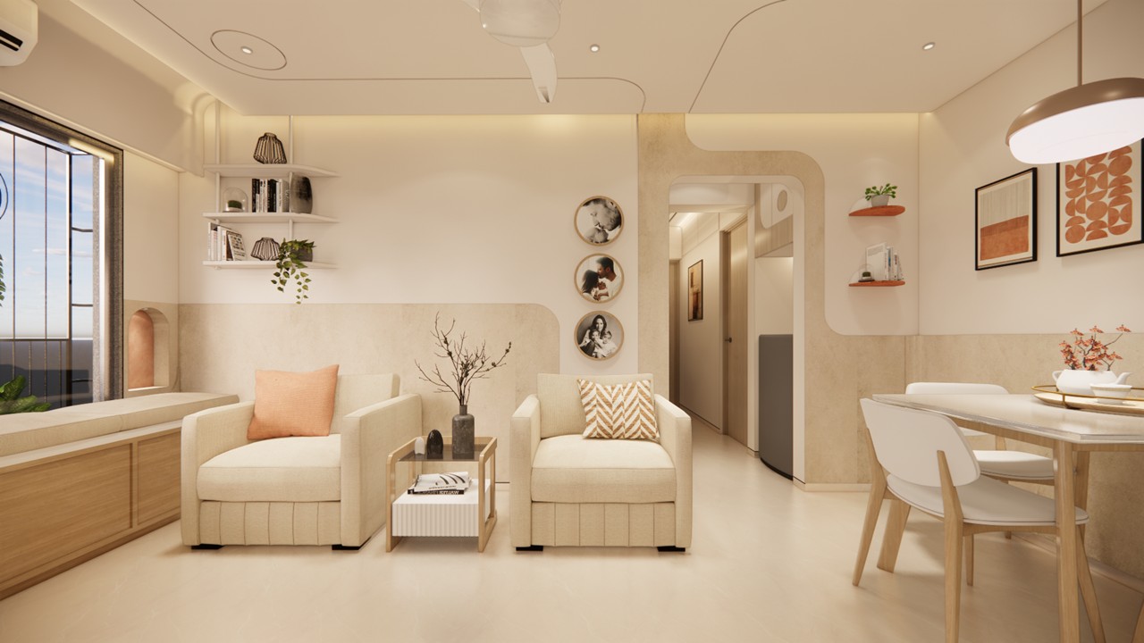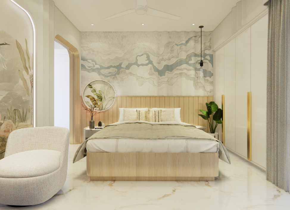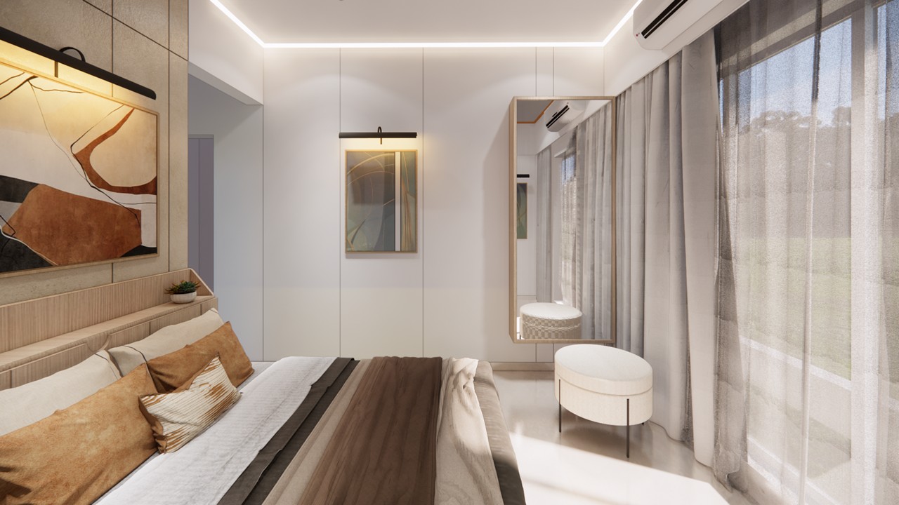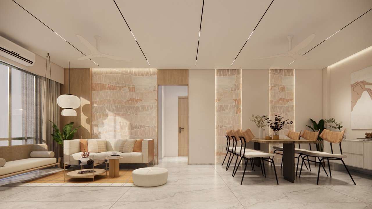 This flat design posed the unique challenge of avoiding a false ceiling while still ensuring effective lighting throughout the space.To address this, we introduced strategic boxing to conceal fire-fighting pipes, transforming these structural necessities into functional open shelving. To maintain a clean, uncluttered ceiling, corner profile lights and other discreet lighting solutions were recommended, ensuring a well-lit environment while preserving the design’s minimal aesthetic.Existing furniture pieces were thoughtfully refurbished to align with the updated material palette, creating a cohesive look without excess. The kitchen is designed to meet essential needs, with the backsplash (dado) serving as a bold, eye-catching element that adds character and visual interest.A multi-functional workspace was integrated to support daily work needs and also adapt easily into a guest bedroom when required—an efficient use of space without compromising comfort.The master bedroom exudes warmth and intimacy, featuring a custom curved bed and a seamlessly integrated dressing unit that continues the soft, flowing design language of the home.Every detail works together to create a calming and functional retreat.