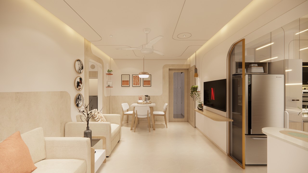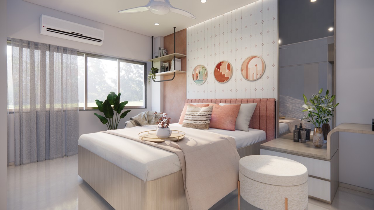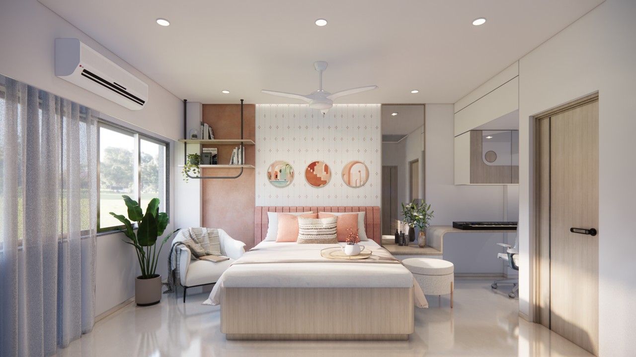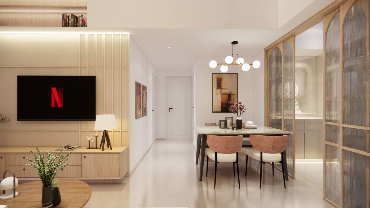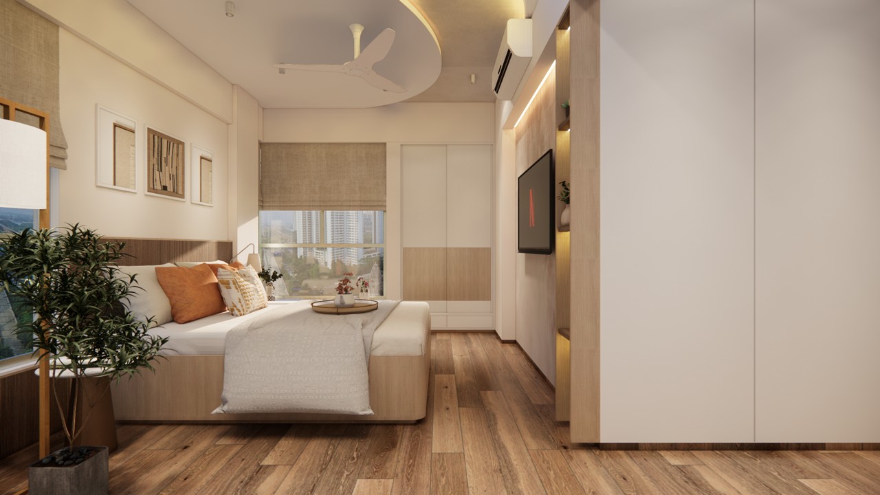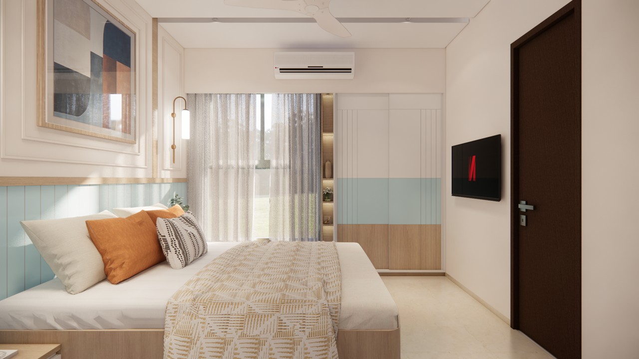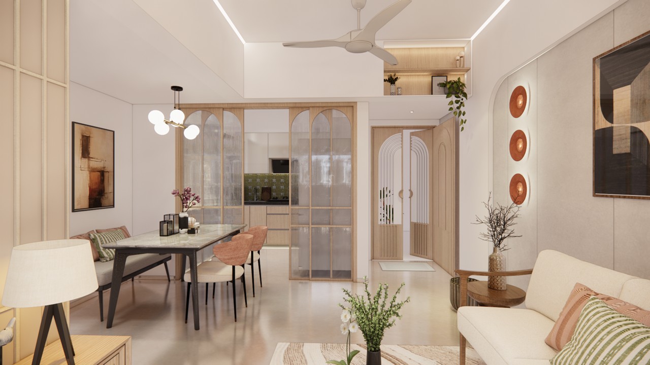 This flat design posed the unique challenge of avoiding a false ceiling while still ensuring effective lighting throughout the space.To address this, we introduced strategic boxing to conceal fire-fighting pipes, transforming these structural necessities into functional open shelving. To maintain a clean, uncluttered ceiling, corner profile lights and other discreet lighting solutions were recommended, ensuring a well-lit environment while preserving the design’s minimal aesthetic.Existing furniture pieces were thoughtfully refurbished to align with the updated material palette, creating a cohesive look without excess. The kitchen is designed to meet essential needs, with the backsplash (dado) serving as a bold, eye-catching element that adds character and visual interest.A multi-functional workspace was integrated to support daily work needs and also adapt easily into a guest bedroom when required—an efficient use of space without compromising comfort.The master bedroom exudes warmth and intimacy, featuring a custom curved bed and a seamlessly integrated dressing unit that continues the soft, flowing design language of the home.Every detail works together to create a calming and functional retreat.