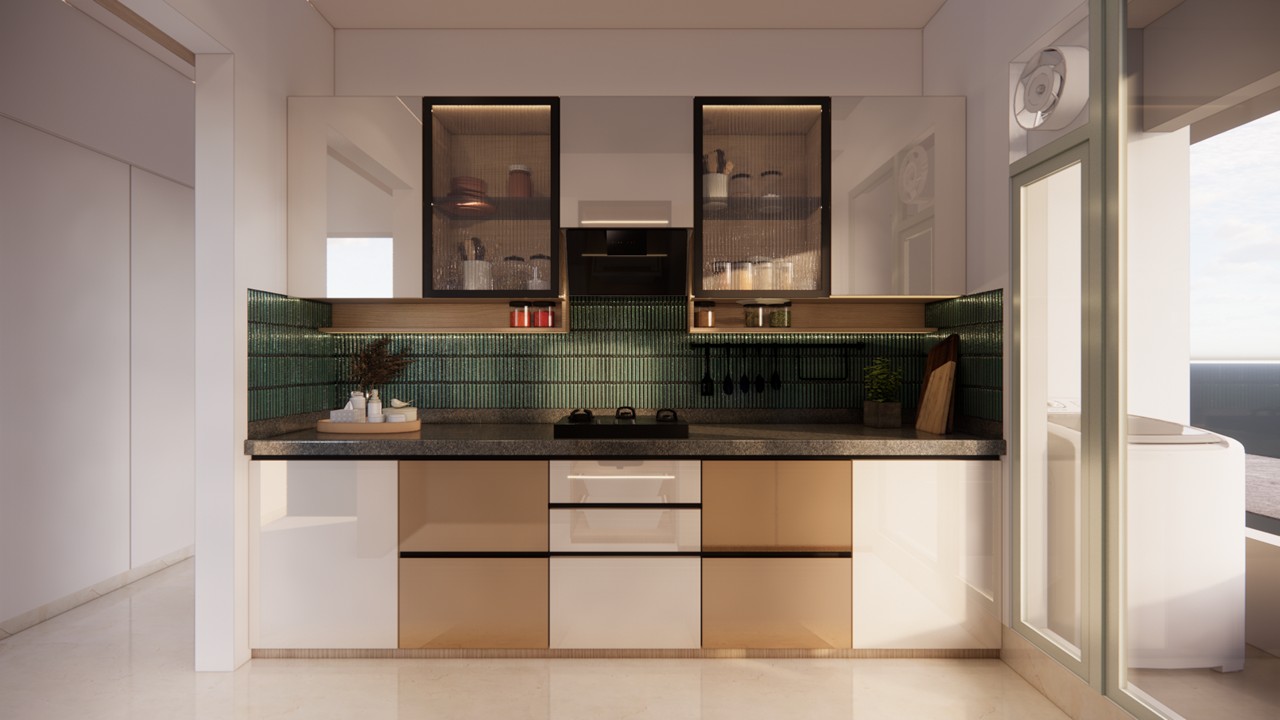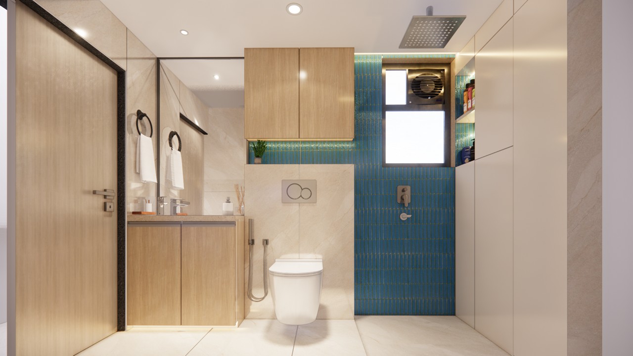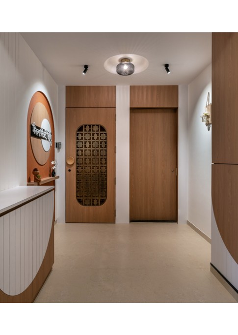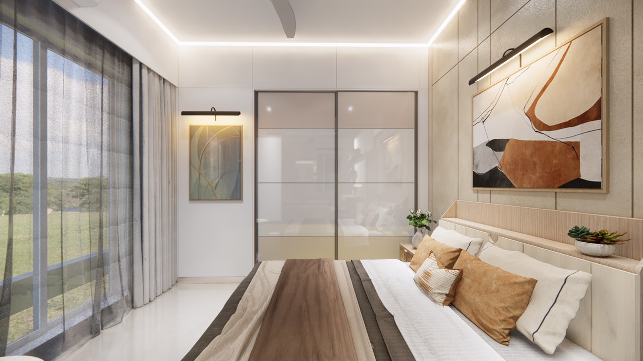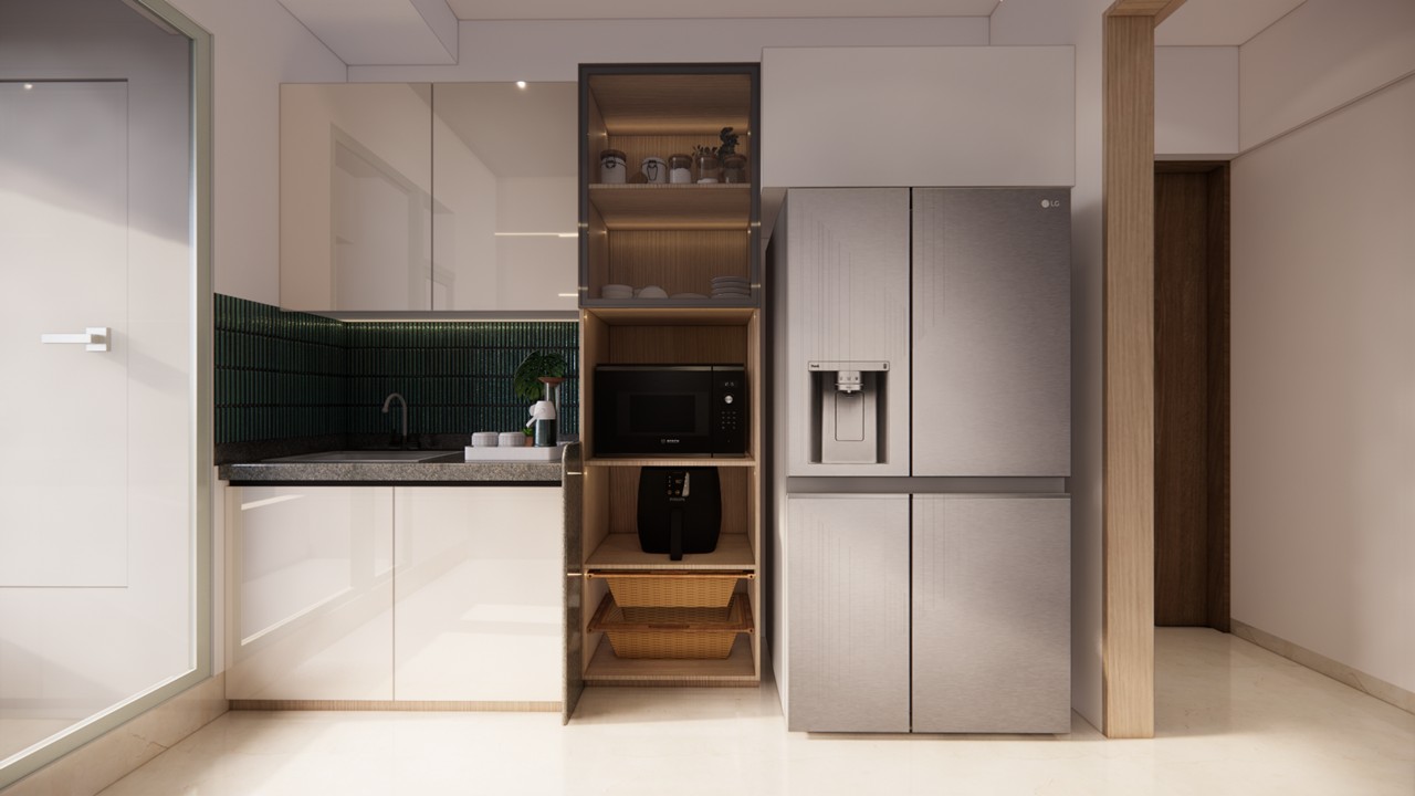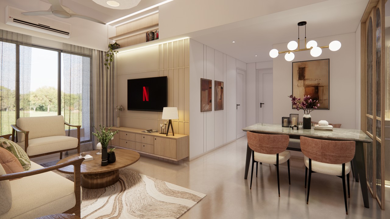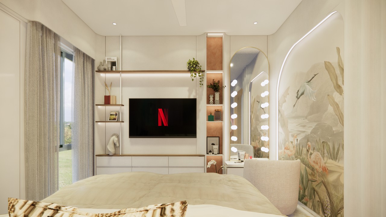 This flat design posed the unique challenge of avoiding a false ceiling while still ensuring effective lighting throughout the space.To address this, we introduced strategic boxing to conceal fire-fighting pipes, transforming these structural necessities into functional open shelving. To maintain a clean, uncluttered ceiling, corner profile lights and other discreet lighting solutions were recommended, ensuring a well-lit environment while preserving the design’s minimal aesthetic.Existing furniture pieces were thoughtfully refurbished to align with the updated material palette, creating a cohesive look without excess. The kitchen is designed to meet essential needs, with the backsplash (dado) serving as a bold, eye-catching element that adds character and visual interest.A multi-functional workspace was integrated to support daily work needs and also adapt easily into a guest bedroom when required—an efficient use of space without compromising comfort.The master bedroom exudes warmth and intimacy, featuring a custom curved bed and a seamlessly integrated dressing unit that continues the soft, flowing design language of the home.Every detail works together to create a calming and functional retreat.