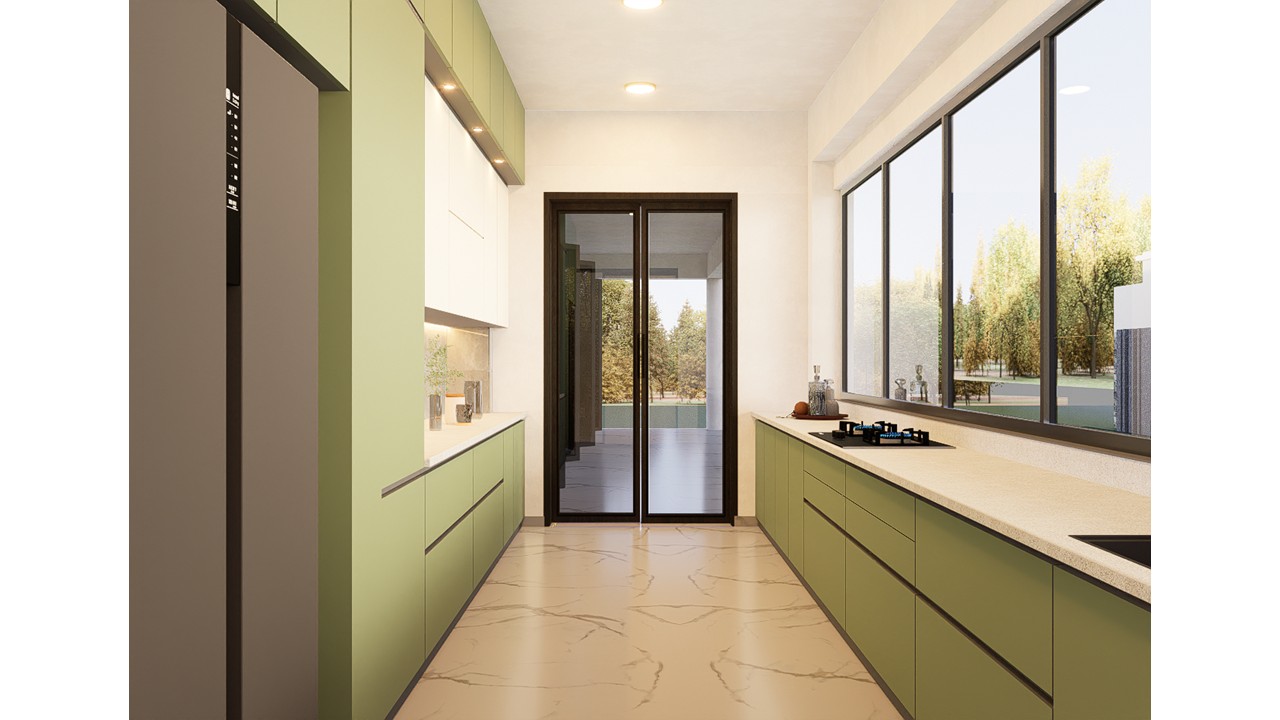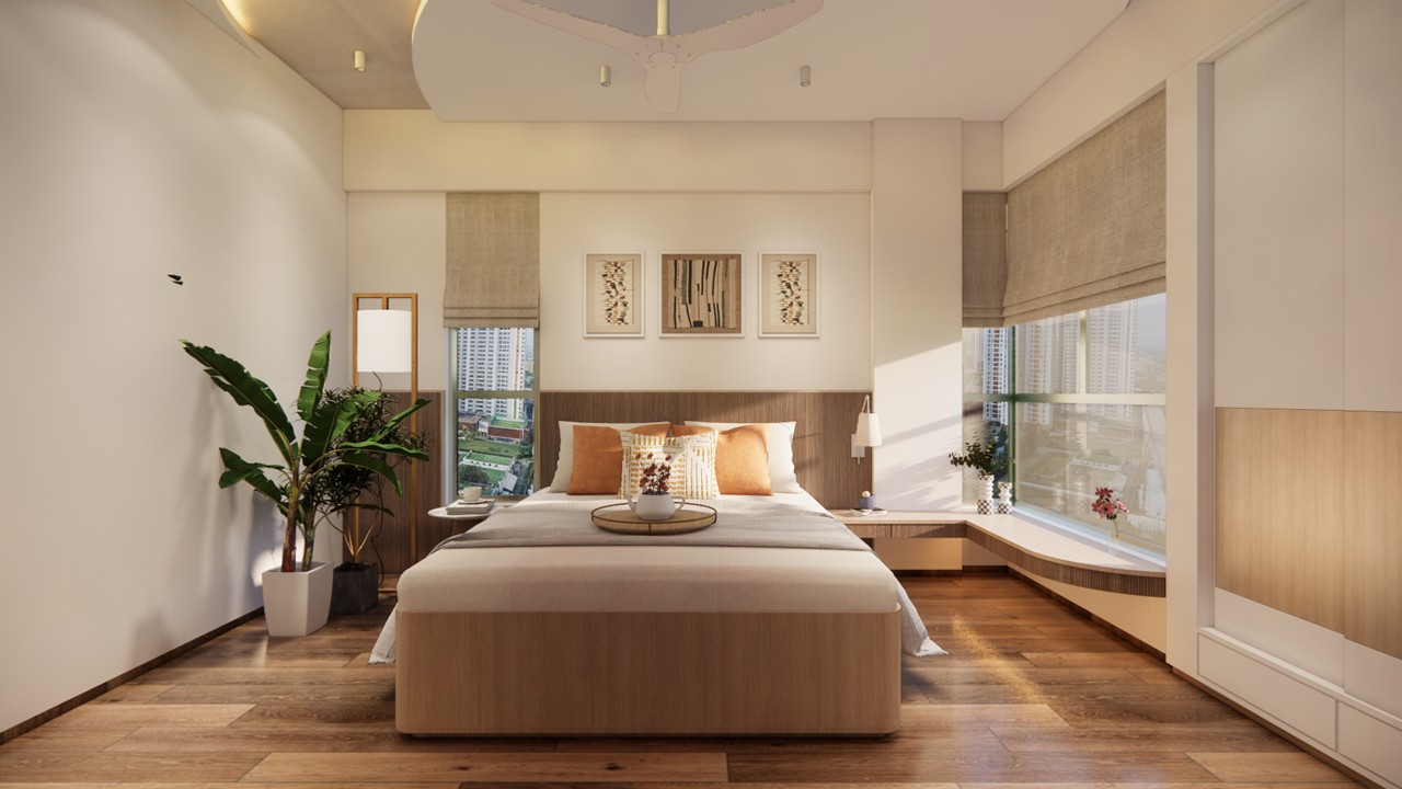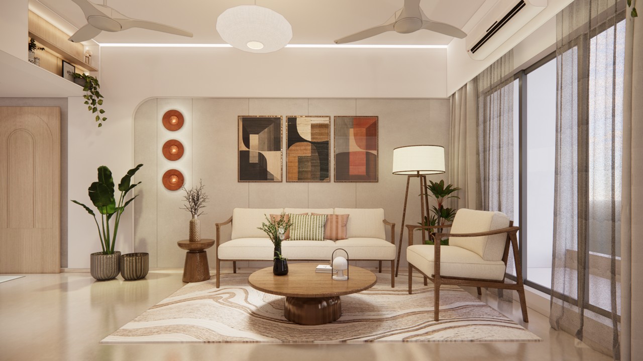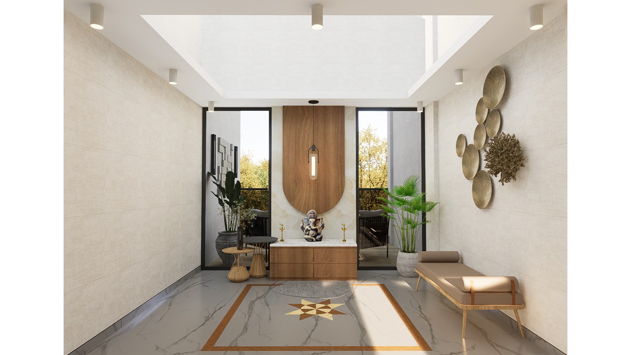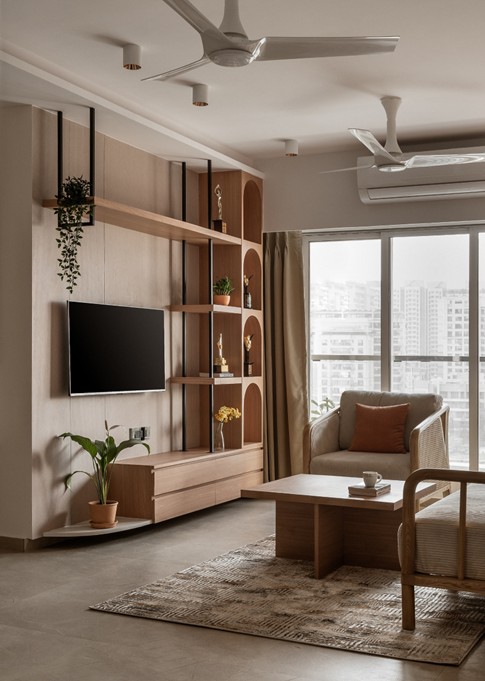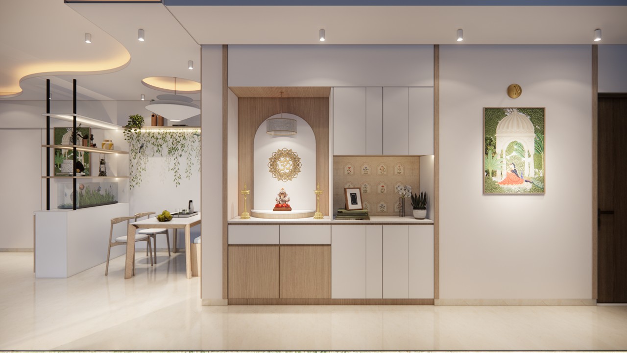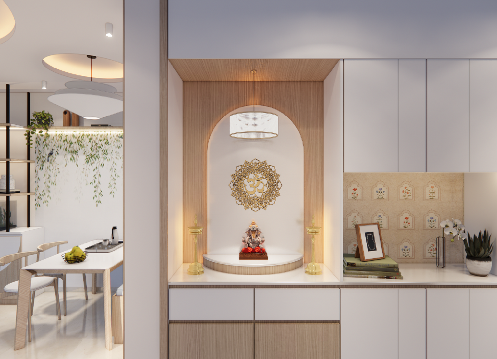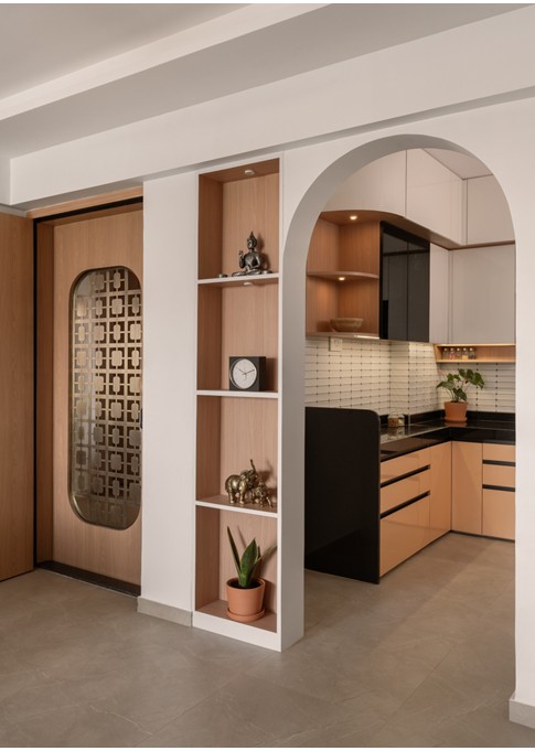 The interiors are curated with a subtle interplay of wallpapers and framed artworks, highlighting the sofa back wall and incorporating an idol as per the client’s specific requirements.The ceiling, shaped with soft curves, gently breaks the rigid geometry of the wall treatments—creating a calming and harmonious spatial composition.Mindful of the client’s elderly age, the design consciously avoids overcrowding the space. Instead, it emphasizes functionality, low maintenance, and ease of use.The flat benefits from abundant natural light, which animates the interiors throughout the day, creating a dynamic atmosphere with ever-changing shadows and reflections.The kitchen has been reconfigured to align with contemporary needs, using a minimal, woody color palette to create a clean, modern aesthetic. The pooja unit, placed thoughtfully in the northeast niche, is a composition of solids and voids—simple yet spiritually grounded.The son’s bedroom responds to both functionality and personal expression, featuring custom storage solutions and framed mementos from his travels that reflect his personality and life experiences. In the master bedroom, the existing wooden flooring sets the tone for a warm and inviting space.Custom furniture in matching warm tones and a cozy window-side seating area—also functioning as a side table—illustrate the design’s commitment to both utility and comfort. The result is a harmonious blend of aesthetic refinement and tailored practicality.