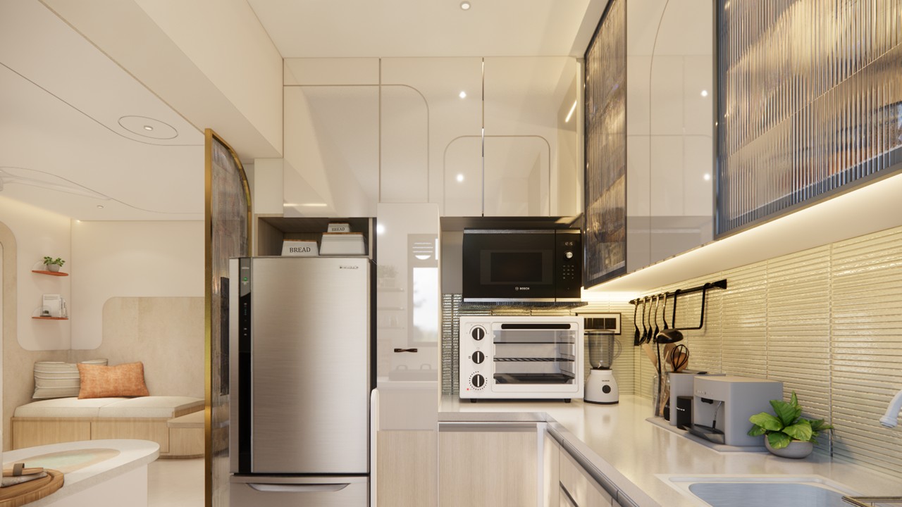 A single curvilinear form gracefully flows throughout the home, seamlessly blending aesthetics with utility.This design approach is anchored in a soothing palette, where terracotta-textured paint introduces warmth and an earthy, organic soul to the modern interior.The transformation begins by removing the wall between the kitchen and living area, creating an open-concept layout that enhances visual continuity and spatial connectivity.In the living area, multifunctionality shines— the sofa cleverly converts into a folding bed, while the window sill doubles as additional seating and discreet storage, showcasing thoughtful space optimization.The son’s bedroom is tailored to accommodate challenging column offsets, ingeniously integrated into custom furniture design.A platform bed not only defines the space but also dedicates room for his drum set, reflecting a balance of leisure and functionality.The master bedroom evolves beyond rest—it’s a hybrid zone for work, relaxation, and reading. A cozy corner with window becomes the perfect retreat for unwinding with a book and coffee, completing the narrative of a home where every curve, material, and function is deeply intentional.