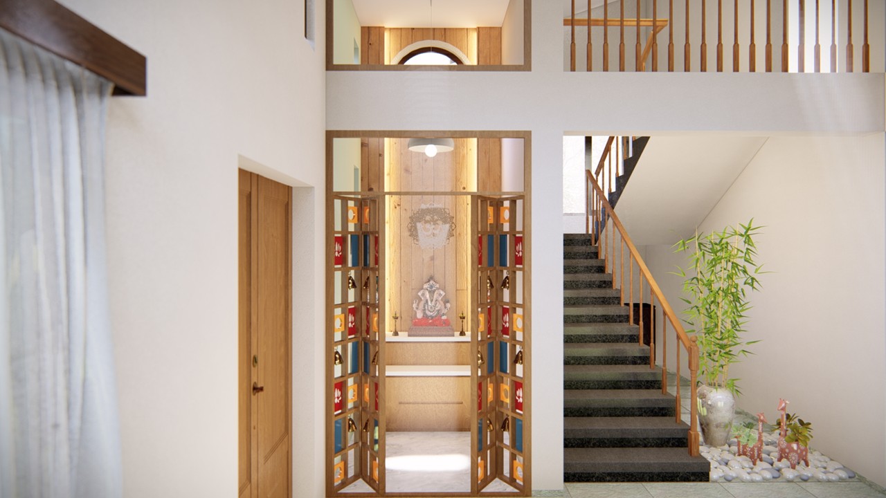 Nestled in the lush green landscape of Kankavali, Konkan, this family home is designed in alignment with Vastu Shastra, incorporating double-height spaces and generously proportioned rooms to foster openness and harmony.The architectural framework was completed within a tight timeline of just six months, demonstrating efficient planning and execution. A defining feature of the house is the series of circular openings on the façade, which lend a distinctive identity to the structure.This bold design choice has transformed the residence into a local landmark. The living area is thoughtfully designed to blend seamlessly with the pooja space, anchored by a clerestory window on the east side.This detail allows soft morning light to filter through, creating a serene and spiritual atmosphere. The exterior palette, composed of white and grey tones, contrasts beautifully with the surrounding earthy context.This subtle yet striking color scheme enhances the visual presence of the home, allowing it to both blend into and stand out from its natural environment.