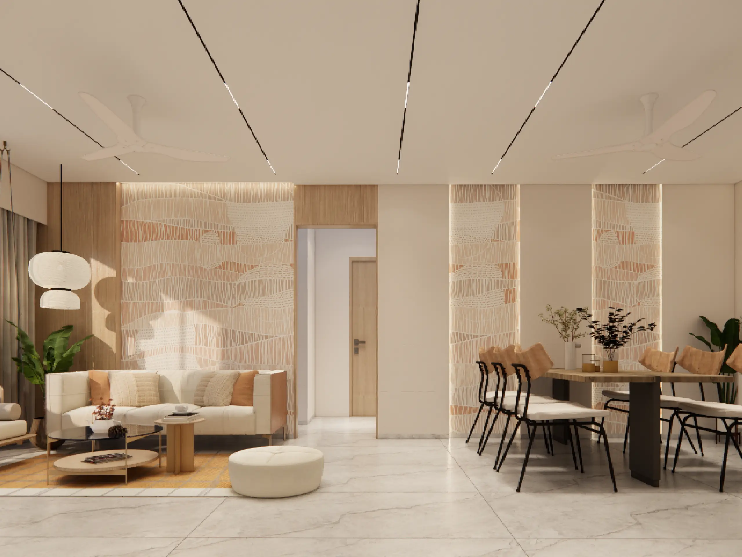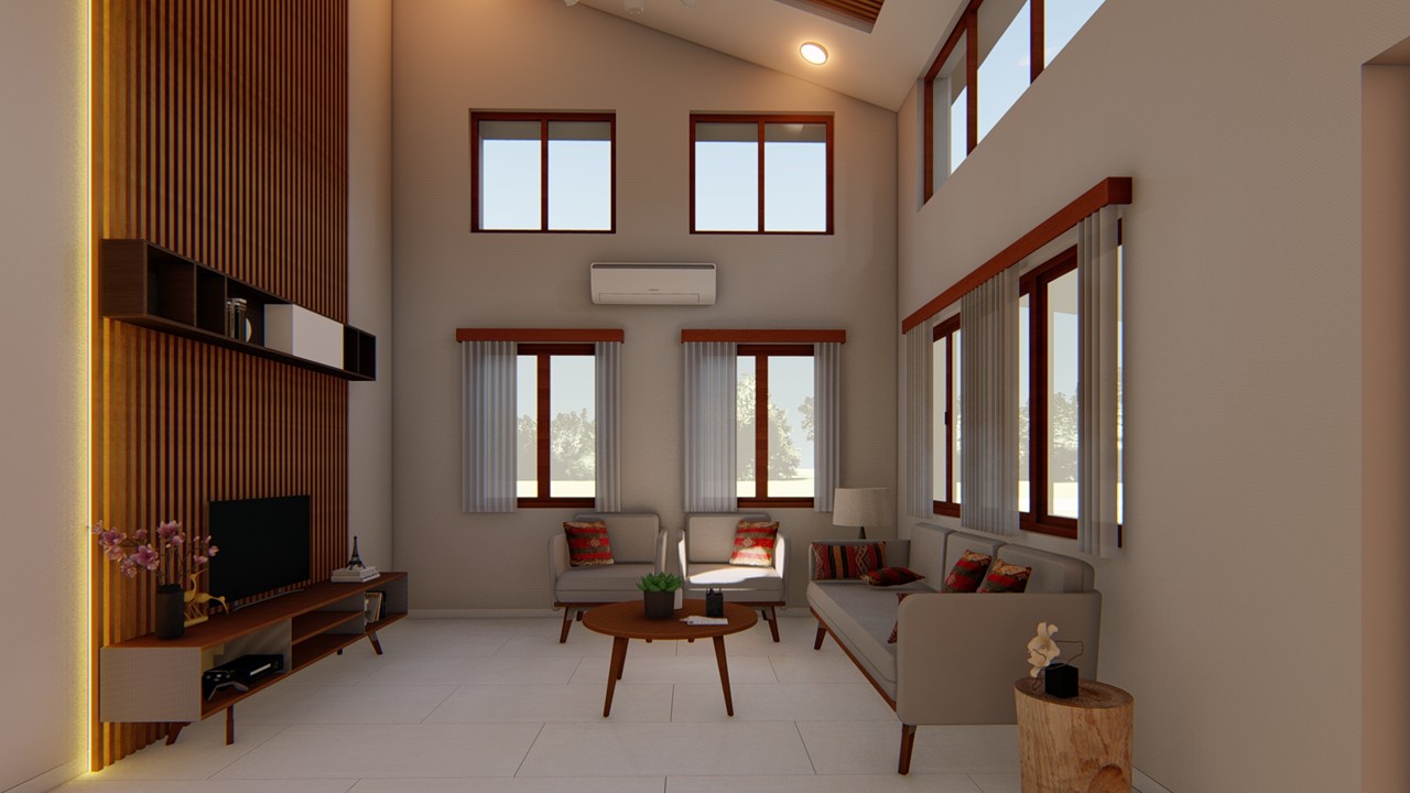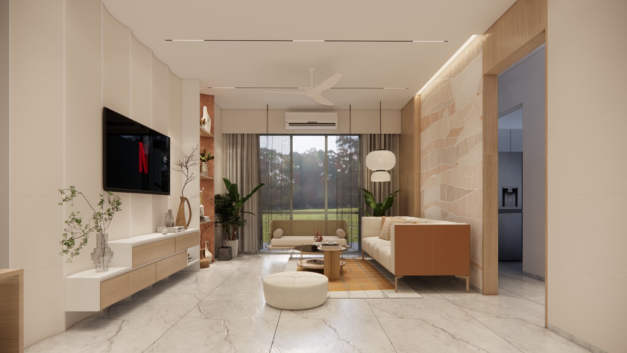 This interior design concept draws inspiration from a modern yet timeless aesthetic, centered around the soothing warmth of natural wood. The living room’s character is elevated through a thoughtful interplay of color and patterned wallpaper, introducing visual interest without overwhelming the space. The ceiling design remains minimalistic, enhanced by sleek track lighting that adds a sense of architectural clarity. These clean, linear elements complement the overall look, reinforcing a calm, contemporary atmosphere with subtle sophistication.