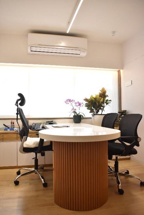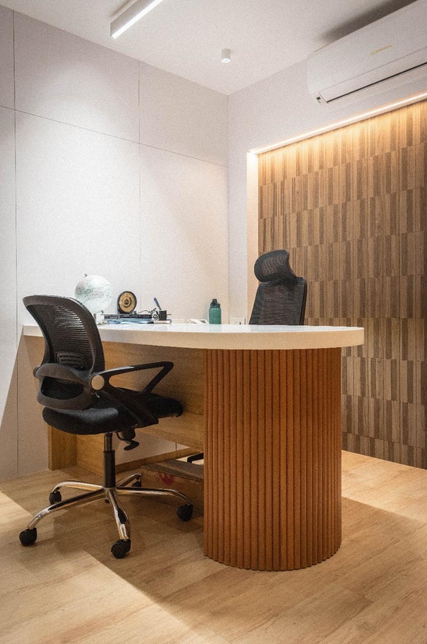 The office is designed to reflect the client’s preference for warm wooden finishes, lending the space a sense of natural elegance and timelessness. One of the key challenges was the low ceiling height of the site. To address this, the design strategically incorporates vertical elements—such as vertical paneling, storage details, and lighting features—to visually break the horizontality and draw the eye upward, effectively enhancing the perception of height.This approach not only resolves the spatial constraint but also adds rhythm and structure to the workspace, creating an environment that feels both spacious and refined, in harmony with the client’s aesthetic vision.